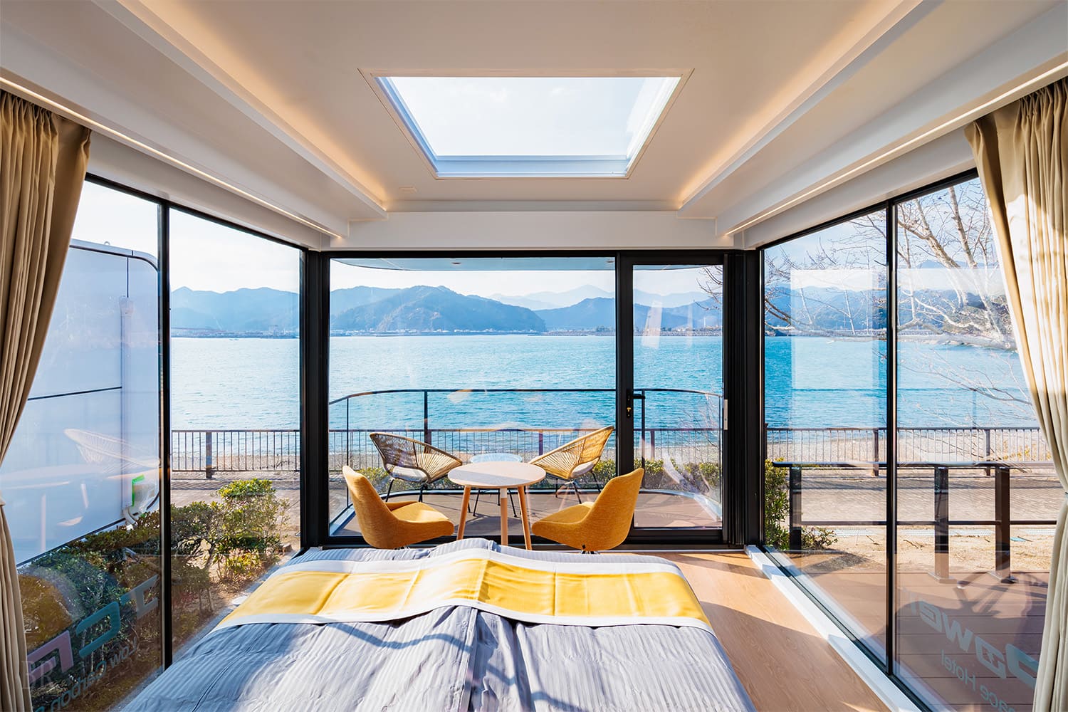 お部屋にはシャワールーム・トイレも完備しており、快適にお過ごしいただけます。さらに、大きく広がるパノラマウィンドウから望む景色は、まるで一枚の絵画のよう。オーシャンビューの絶景を眺めながら、ゆったりと流れる特別な時間をお楽しみください。